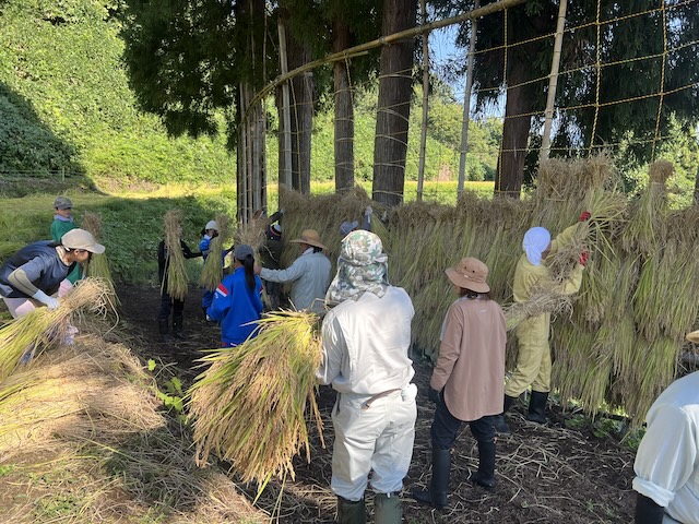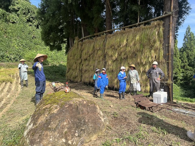 9月28日(日)午前9:00から、はさに掛けるコシヒカリの稲刈を行いました。上達会館近くの小さい田で、10a(1反)程度を刈りました。組合員、子供会、青年会で手刈り、とバインダーで刈って、はさに掛けました。子供たちを含めて23人で、予定どおり2時間程度で終わりました。稲上げは、2〜3週間後の予定で、来月には、おいしい「はさがけ米」になります。